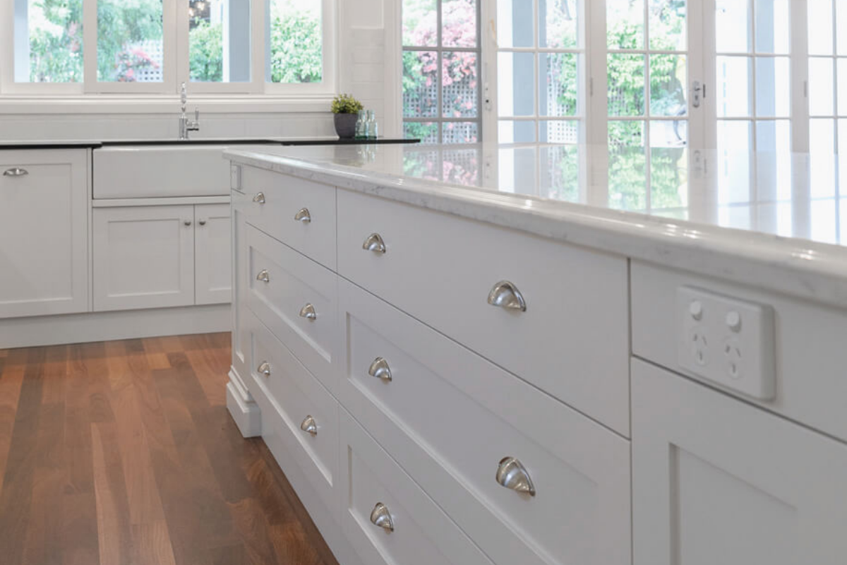 Using a very simple, streamlined handle on minimalist-style cabinets with flat-fronted doors and drawer fronts invokes a sleek, contemporary look.