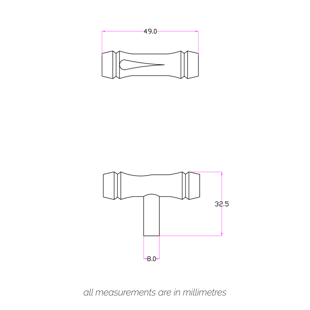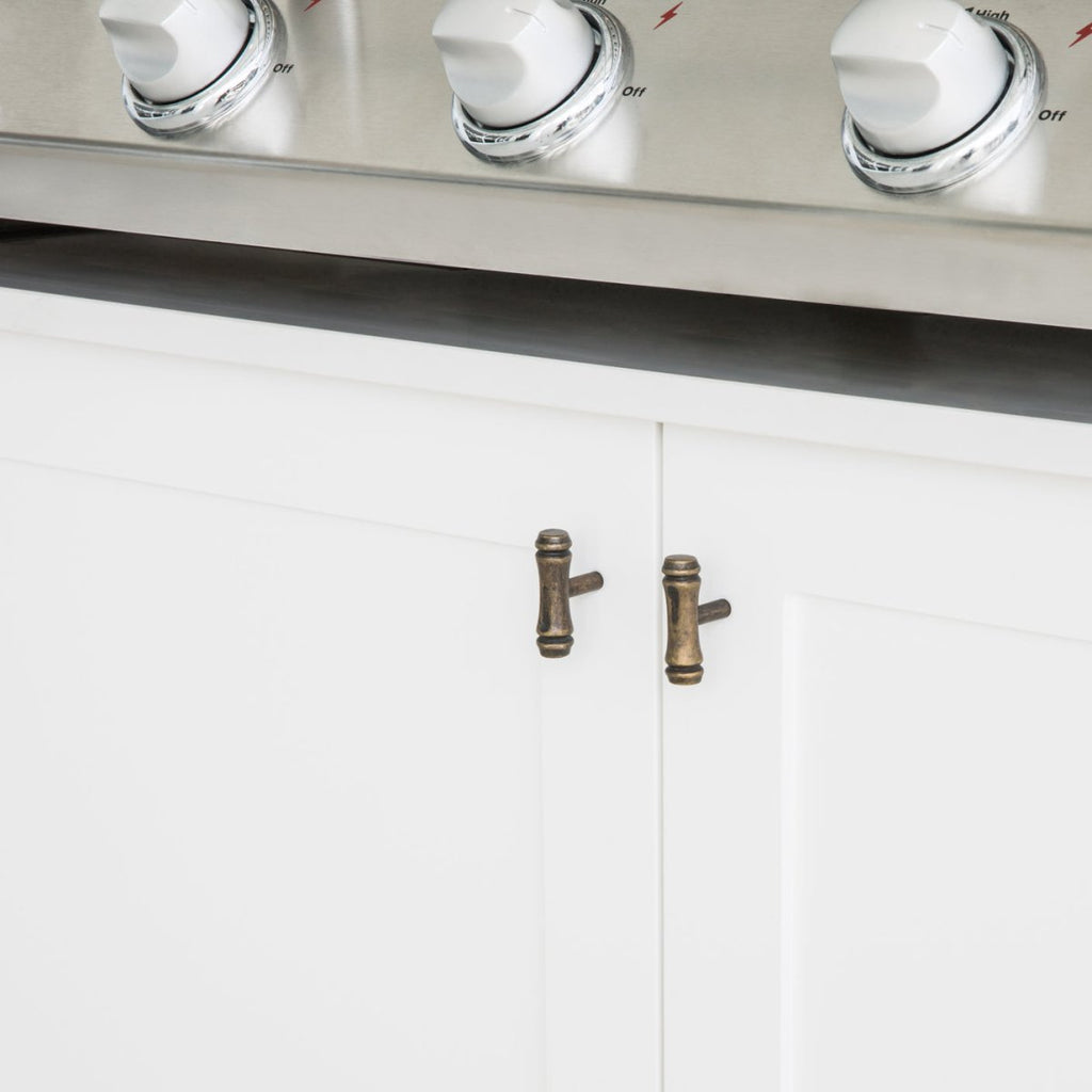 Our bamboo t-bars are available in three finishes: polished nickel and burnished brass and antique brass. If you like to coordinate your hardware, our antique brass bamboo t-bars have a matching antique brass handle.